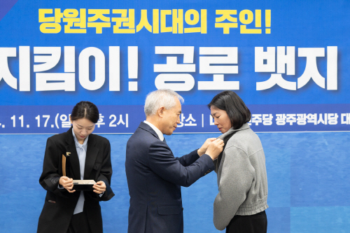더불어민주당 광주시당은 지난 7월 17일 당사 대회의실에서 20년 이상 민주당 당적을 유지하고 있는 당원을 대상으로 공로 배지 수여식을 열었다. 당원에게 직접 배지를 달아주는 양부남 광주시당위원장. [양부남 의원실 제공]
