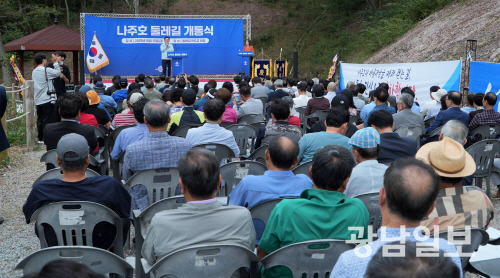 20일 나주시에 따르면 최근 다도면 방산리에 위치한 둘레길 인도교 광장에서 나주호 둘레길 개통식를 진행했다. 행사에는 윤병태 나주시장과 이재남 나주시의회 의장 등 200여명이 참석했다.