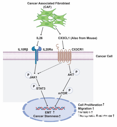 실험 결과 IL26은 JAK-STAT3 경로를, CX3CL1은 AKT-mTOR 경로를 활성화 시켜 암세포의 침투력과 생존력을 높였으며, 이에 따라 상피간엽이행(EMT)과 암줄기세포 특성이 강화되는 것으로 나타났다.