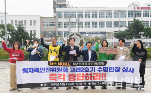 핵없는 세상 광주전남행동이 21일 광주 동구 금남로 5·18민주광장에서 기자회견을 열고 원자력안전위원회 고리2호기 수명연장 심사 즉각 중단을 촉구하고 있다.