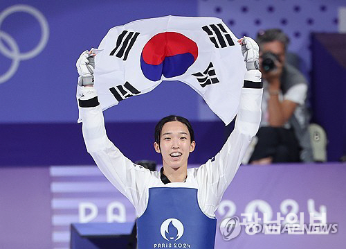 김유진, 태권도장에서 태극기 휘날리며(파리=연합뉴스) 임화영 기자 = 8일(현지시간) 프랑스 파리 그랑팔레 태권도경기장에서 열린 2024 파리올림픽 태권도 여자 57kg급 결승에서 한국의 김유진이 이란의 나히드 키야니찬데를 꺾고 금메달을 확정한 뒤 태극기를 들고 환호하고 있다. 연합뉴스