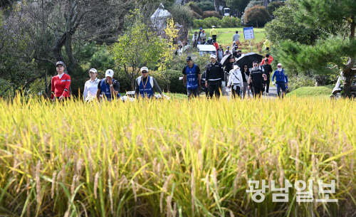 25일 나주 해피니스 컨트리클럽에서 열린 한국여자프로골프 (KLPGA) 투어 ‘광남일보·해피니스 오픈’ 2라운드에서 해피코스 1번홀에서 티샷을 마친 한진선, 김민솔, 정주리 선수와 갤러리들이 노랗게 익어가는 벼 옆을 지나가고 있다.