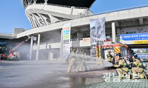 27일 오후 광주월드컵경기장에서 열린 ‘재난대응 안전한국훈련’에 참여한 광주 서구청과 서부소방서 등 유관기관 및 민간단체들이 지진·화재 발생 등 대형 재난 발생 상황을 가장한 현장 훈련을 하고 있다.