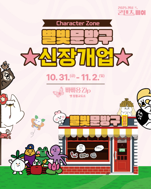 캐릭터존 전시는 진흥원이 운영하는 전남콘텐츠코리아랩의 대표 캐릭터 2종과 ‘전남도 이모티콘 공모전’을 통해 선정된 이모티콘 수상작 4종을 함께 선보이며, 전남도의 문화·자연·지역 정체성을 담은 창작 IP(지식재산)를 전시와 체험을 통해 시민들에게 소개하는 자리다. 전시 공간은 ‘문방구’를 콘셉트로 꾸며져 관람객이 친근하게 캐릭터를 접할 수 있도록 구성됐다.