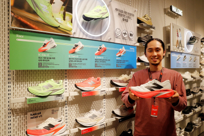 광주신세계 플레이스팟 뉴발란스 매장에 다양한 러닝 용품이 전시돼 있다. 러닝 트렌드 인기로 뉴발란스는 전년 대비 매출이 크게 상승했다.
