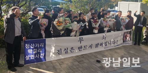 16년 만에 누명을 벗은 백모씨(75)와 딸(41), 박준영 변호사 등이 광주고법 앞에서 기자회견을 열고 “진실은 반드시 밝혀진다”고 외치고 있다.