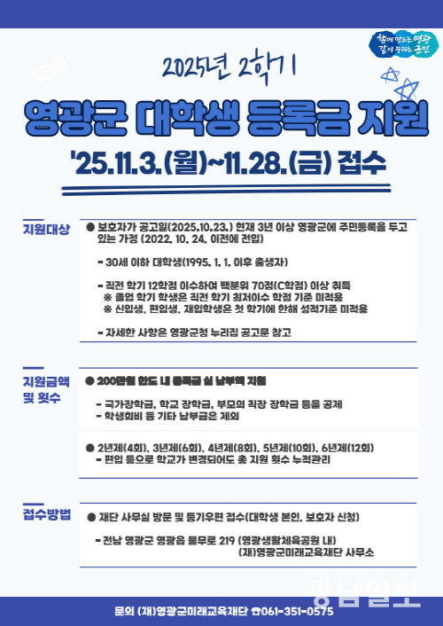 (재)영광군미래교육재단(이사장 장세일)은 군민의 교육비 부담을 줄이고 지역의 미래 인재를 육성하기 위한 2025년 2학기 대학생 등록금 지원사업을 시행한다.