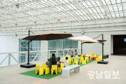 광주비엔날레 전시관 중정에서 휴식을 취하고 있는 관람객들.