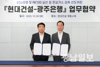 광주은행은 현대건설과 ESG경영 및 RE100 실천 등 온실가스 감축 선도를 위한 업무협약을 체결했다고 29일 밝혔다.