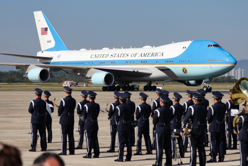 경주 APEC을 계기로 국빈 방한하는 도널드 트럼프 미국 대통령의 에어포스원이 29일 부산 김해국제공항에 도착하고 있다.