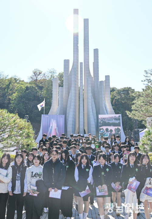 3일 오전 광주 서구 화정동 광주학생독립운동기념탑에서 열린 제96주년학생독립운동기념식에 참석한 학생들이 참배한 뒤 이동하고 있다. 학생독립운동은 1929년 11월 3일 광주에서 시작되어 이듬해 3월까지 전국 320여 개의 학교에서 54,000여 명의 학생들의 참가한 항일 시위운동이다.