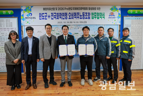 완도군운 최근 전국화학연맹 오비맥주 노동조합(위원장 박태욱)과 해양치유산업 활성화와 2026 Pre완도국제해조류박람회 성공 개최를 위한 업무협약을 체결했다.