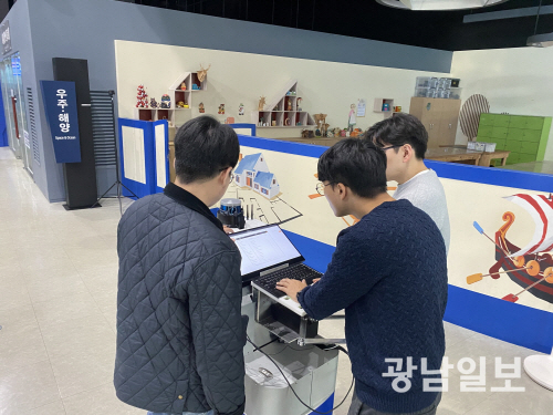 국립광주과학관(관장 이정구)은 최근 광주과학기술원(총장 임기철)과 함께 ‘시각장애인 맞춤형 전시 관람 서비스’를 성공적으로 운영했다. 사진은 광주과학기술원 연구원들이 시각장애인 맞춤형 전시 관람 서비스를 조정하는 모습.
