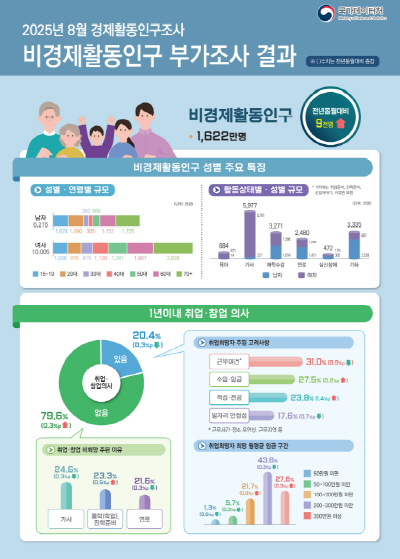 비경제활동인구(올해 8월 기준)는 1622만명으로 전년 동월 대비 9000명 증가했다.