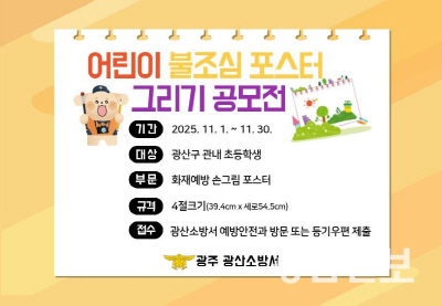 광주 광산소방은 ‘제78회 불조심 강조의 달’을 맞아 오는 30일까지 지역 초등학생을 대상으로 ‘어린이 불조심 포스터 그리기 공모전’을 진행한다고 밝혔다.