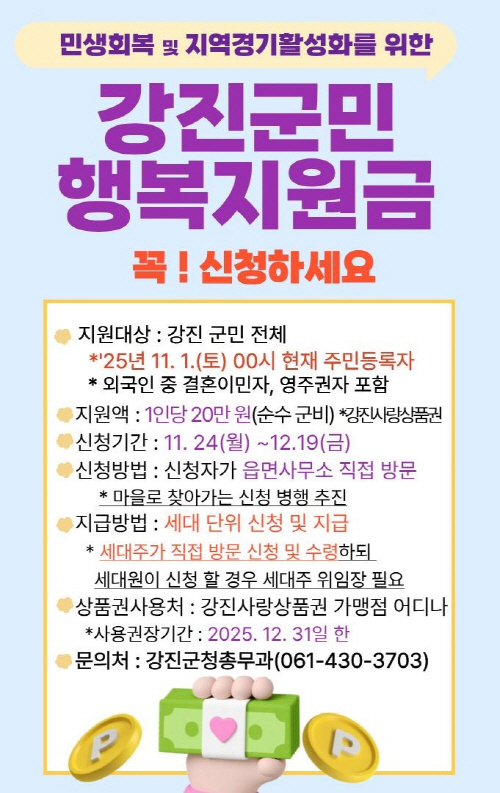 강진군 군민행복지원금은 오는 24일부터 12월 19일까지 지급된다. 군민 1인당 20만원씩 전액 지류형 강진사랑상품권으로 지급되며 온라인 신청 및 지급은 하지 않는다.