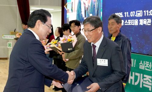 김영록 전남도지사가 7일 영광스포티움 국민체육센터에서 열린 ‘2025 전남 4-H가족 어울림한마당’ 행사에서 유공자들에게 시상을 하고 기념촬영을 하고 있다.
