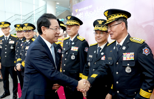 김영록 전남도지사가 7일 영광군 예술의 전당에서 열린 ‘제63주년 소방의 날 기념식’ 행사에서 시군 소방서장들을 격려하고 있다.