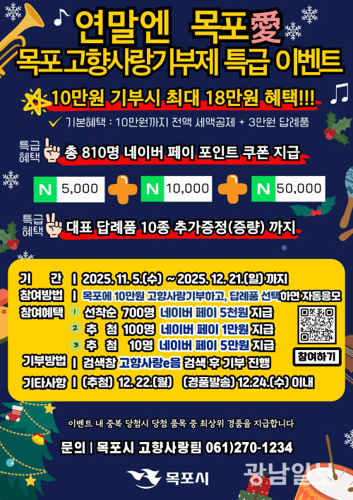 목포시는 본격적인 연말정산 준비 시기를 맞아 올해 마지막으로 ‘연말엔 목포愛~ 고향사랑기부제 특급 이벤트’를 진행한다.