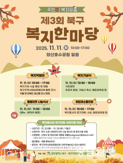 광주 북구가 개최하는 ‘복지한마당’ 행사가 11일 양산호수공원 일대에서 열린다.