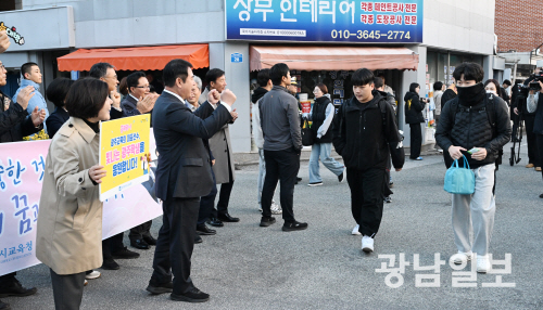 2026학년도 대학수학능력시험일인 13일 오전 광주시 교육청 26지구 제21시험장인 광주 서석고등학교에서 이정선 교육감이 수험생을 응원하고 있다.