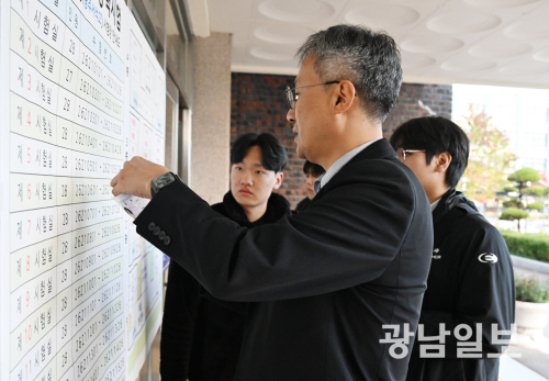 2026학년도 대학수학능력시험일인 13일 오전 광주시 교육청 26지구 제21시험장인 광주 서석고등학교에서 선생님이 수험생들에게 시험장을 알려주고 있다