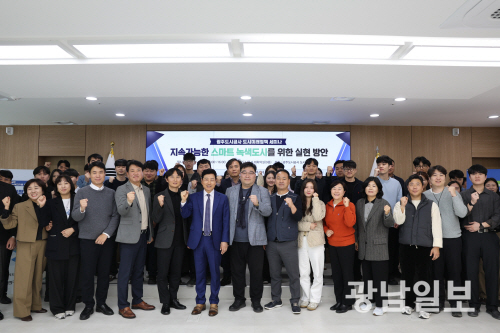 13일 광주도시공사 대회의실에서 열린 ‘도시미래정책 세미나’에 참석한 관계자들이 기념사진을 촬영하고 있다. 사진제공=광주도시공사