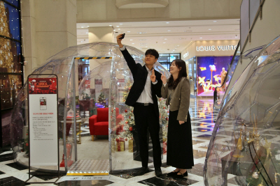 광주신세계 본관 1층 광장에 마련된 이글루 형태로 꾸며진 룸 앞에서 고객들이 사진을 찍고 있다.