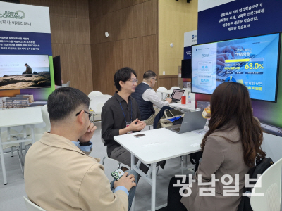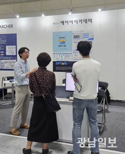 정인택 대표가 지난 10월 15~17일 광주 서구 김대중컨벤션센터에서 열린 ‘인공지능 테크 플러스(AI TECH+) 2025’에 참가해 방문객에게 GPTalk를 소개했다.