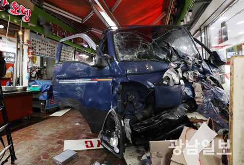 사고 차량은 전통시장 내 100여m를 주행하다가 인근 점포를 들이받고 멈춰 선 것으로 전해졌다.