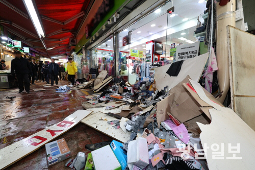 13일 오전 10시 55분께 경기 부천시 오정구 원종동 제일시장에서 주행 중인 트럭이 상점 앞으로 돌진하는 사고가 발생해 트럭이 치워진 상점 앞에 옷가지 등이 흩어져 있다. 연합뉴스