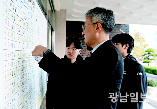2026학년도 대학수학능력시험일인 13일 오전 광주시 교육청 26지구 제21시험장인 광주 서석고등학교에서 선생님이 수험생들에게 시험장을 알려주고 있다. 최기남 기자 bluesky@gwangnam.co.kr