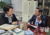 정인화 시장이 조계원 국회의원을 만나 사업설명을 하고 지원을 요청하고 있다.