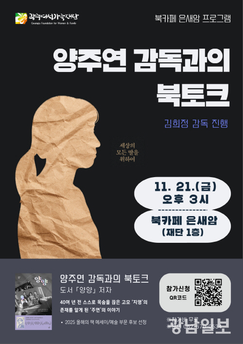 광주여성가족재단(대표이사 오미란·이하 재단)은 오는 21일 오후 3시 재단 1층 북카페 은새암에서 양주연 감독과의 북토크를 연다.