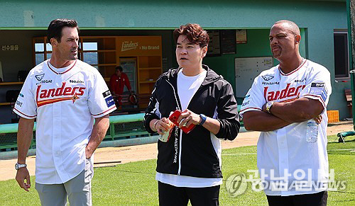 11일 인천 강화군 SSG 퓨처스필드에서 열린 SSG 퓨처스 선수단 ‘MLB 레전드 멘토링 데이’에서 추신수(가운데) SSG랜더스 육성총괄이 메이저리그에서 활약한 콜 해멀스(왼쪽), 아드리안 벨트레와 퓨처스 선수들의 훈련을 지켜보며 대화하고 있다. 연합뉴스.