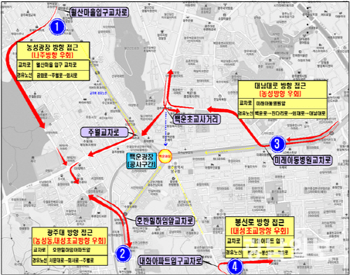 통제 구간 차량 우회도로는 △농성교차로에서 백운광장 방향 → 월산마을 입구 교차로에서 양궁장 방향 △광주대에서 백운광장 → 호반힐하임 교차로에서 양궁장 방향 △남광주(봉선·방림)에서 백운광장 → 미래아동병원 교차로에서 기독병원(수피아여고) 방향 △봉선동에서 백운광장 방향 → 대화아파트 입구 교차로에서 봉선중앙로(봉선초교) 방향 등이다.