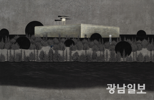 윤준영 작가는 현재 광주에 거주하며 인간 존재와 내면의 불안을 시각적 언어로 탐구하는 작업을 이어오고 있다. 그는 ‘바깥에서 들여다보는 시선’을 통해 자신을 상실한 자, 추방된 자, 그리고 ‘더 이상 나라고 말할 수 없는 자’의 자리를 응시한다. 작가는 한지에 먹과 콩테를 사용해 새, 물, 달과 같은 존재들의 은유적 풍경을 그린다. 풍경은 단순한 어둠의 표상을 넘어 마음의 상태와 빛의 움직임, 온기의 변화를 동시에 담고 있다.