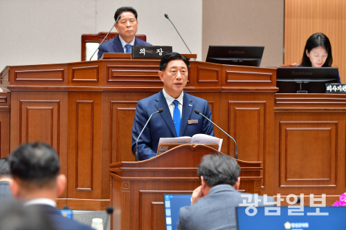 김한종 장성군수가 지난 20일 열린 군의회 정례회에서 내년도 예산안에 대해 설명하고 있다.
