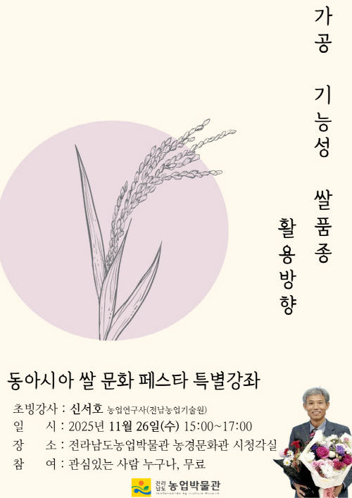 전남도농업박물관은 26일 오후 3시 ‘동아시아 쌀 문화 페스타’ 다섯 번째 특별강좌를 열어 국내 대표 쌀 품종 개발 전문가를 초청해 미래 쌀 산업의 혁신 모델을 제시한다.