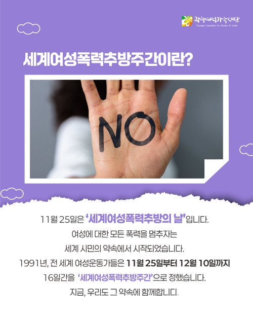 세계여성폭력추방주간은 매년 11월 25일부터 12월 10일까지 이어지는 국제 캠페인 기간으로 여성폭력 근절과 성평등 가치의 중요성을 전 세계가 함께 알리는 시기다. 재단은 올해 성평등가족부가 제시한 슬로건 ‘폭력 없는 안전한 일상, 존중이 빛나는 사회’에 맞춰 시민 참여 방식의 홍보를 강화해 더 많은 시민들이 기간의 의미를 체감하도록 준비했다.