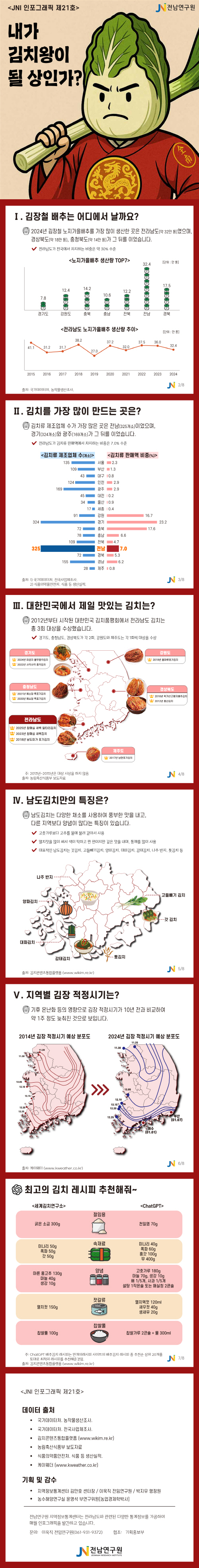 25일 전남연구원은 JNI 인포그래픽 ‘내가 김치왕이 될 상인가’를 통해 김치의 맛과 지역 정체성, 배추 생산 구조, 시장 규모, 기후 변화, 조리 특성 등을 시각적으로 분석해 전남 김치산업의 경쟁력 제고 방향을 제시했다.
