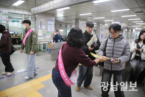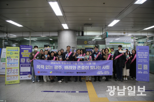 광주여성가족재단(대표이사 오미란·이하 재단)은 여성폭력 추방주간을 맞아 광주교통공사(김지훈 고객사업처장)와 지난 25일 상무역에서 공동 캠페인을 진행했다.