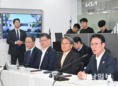 김민석 국무총리가 26일 광주 서구 기아 오토랜드 광주공장을 방문, 송호성 기아 사장 등 경영진과 환담하고 있다. 광주·전남 사진기자단