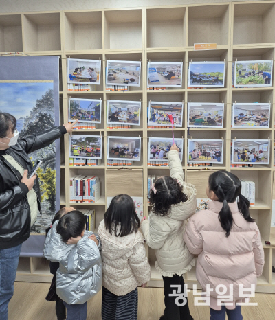 광주효천1LH1단지 가산작은도서관이 진행하고 있는 성과물 전시회를 관람하고 있는 아이들.