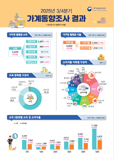 27일 국가데이터처가 발표한 ‘2025년 3분기 가계동향조사’에 따르면 가구당 월평균 소득은 543만9000원으로 전년 동기보다 3.5% 증가했다.