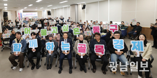 27일 광주 동구 산수동 푸른마을공동체센터에서 열린 동구전지역 골목형 상점가 지정 선포식에 참석한 임택 동구청장과 소상공인들이 퍼포먼스를 펼치고 있다.