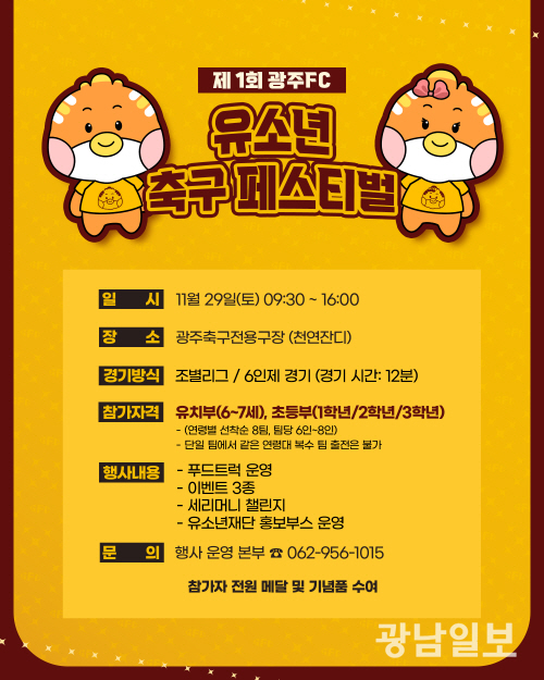 광주는 29일 광주축구전용구장에서 유소년 축구 저변 확대와 지역사회 스포츠 문화 활성화를 위해 ‘제1회 광주FC 유소년 축구 페스티벌’을 개최한다고 27일 밝혔다.