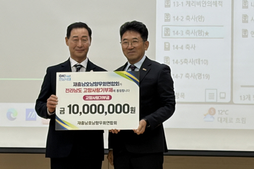 특히 충남호남향우회에서는 정치균 부회장 300만 원, 김용석 사업국장 300만 원, 문상식 자문위원 300만원 등 총 1000만 원의 고향사랑기부금을 전남도에 기탁해 몸소 고향사랑을 실천, ‘전남 고향사랑기부제 명예의 전당’에 헌액되는 영예를 안았다.