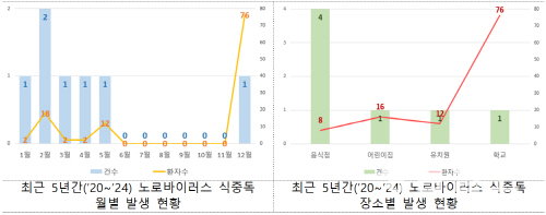 광주시가 최근 5년간(2020년~2024년) 광주지역 노로바이러스 식중독 발생 현황을 분석한 결과, 전체 환자 112명 중 96명이 겨울철(12~2월)에 발생해 전체의 86%를 차지한 것으로 나타났다.
