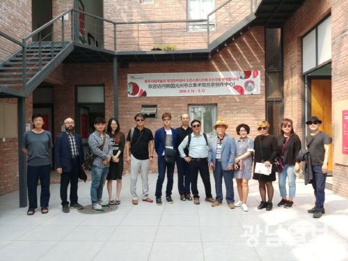 북경창작센터를 방문한 광주작가들이 포즈를 취하며 기념촬영을 하는 모습.